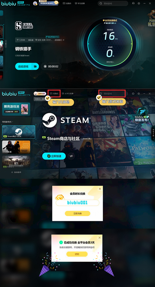 如果在组队的过程中因为网络卡顿而影响到体验的心情,不如就选择一款加速器。现在使用加速器还有免费加速时长。biubiu加速器推出了领取免费加速时长的活动,新用户在第1次注册之后有3小时的加速礼包。使用兑换码【biubiu001】还可以,额外的延长72小时,总共是免费75小时。