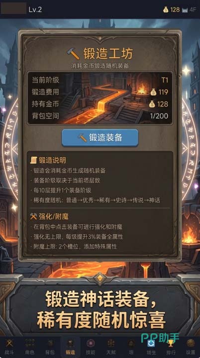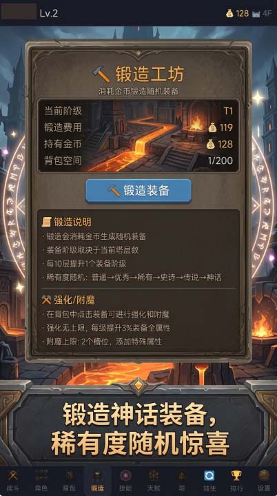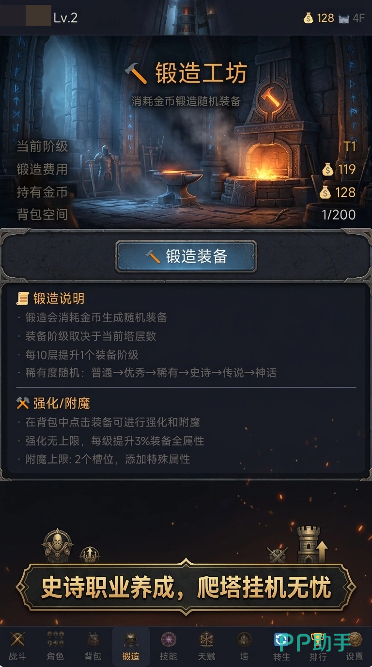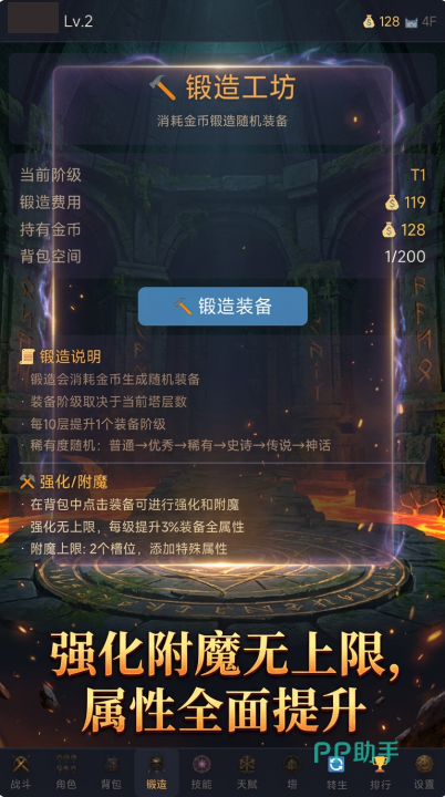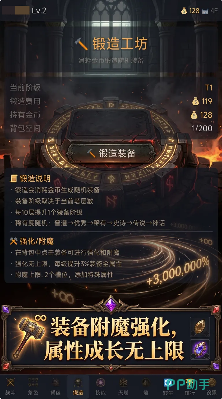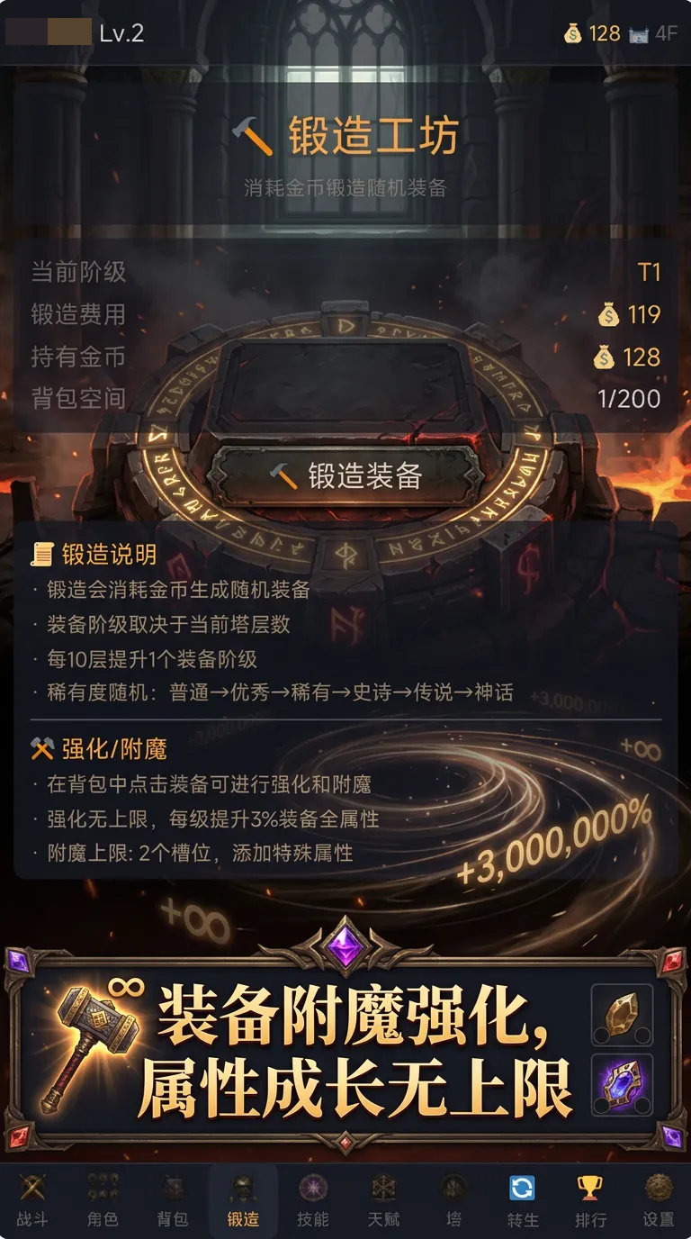 整体玩法复刻暗黑系经典循环:清怪→爆装→强化→挑战更高难度内容。塔层无上限设定保障了长线目标感,同时针对移动端操作习惯优化交互逻辑,全程支持单手触控,大幅降低操作门槛。
