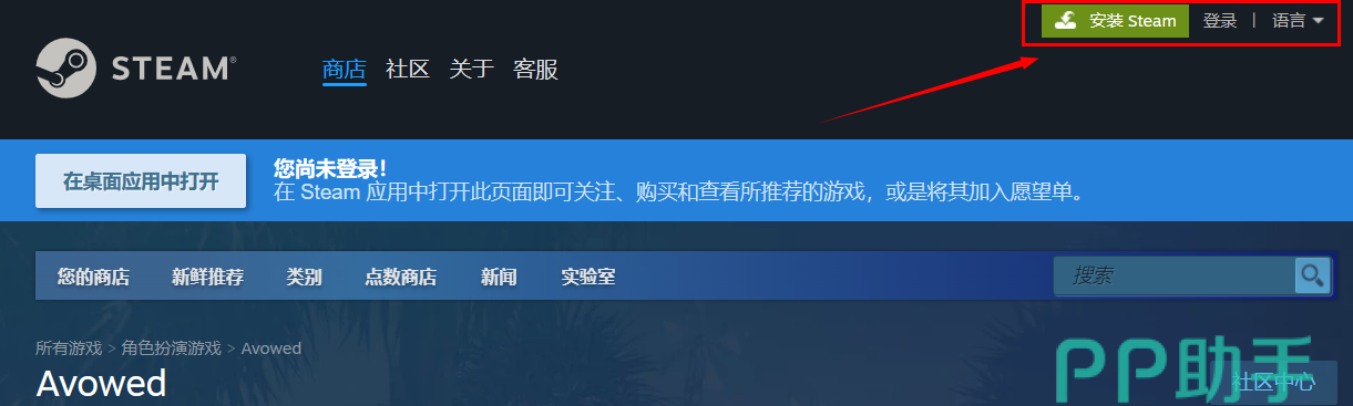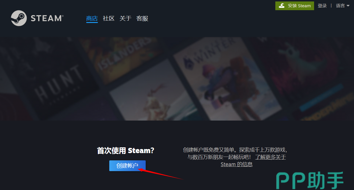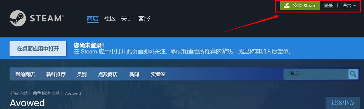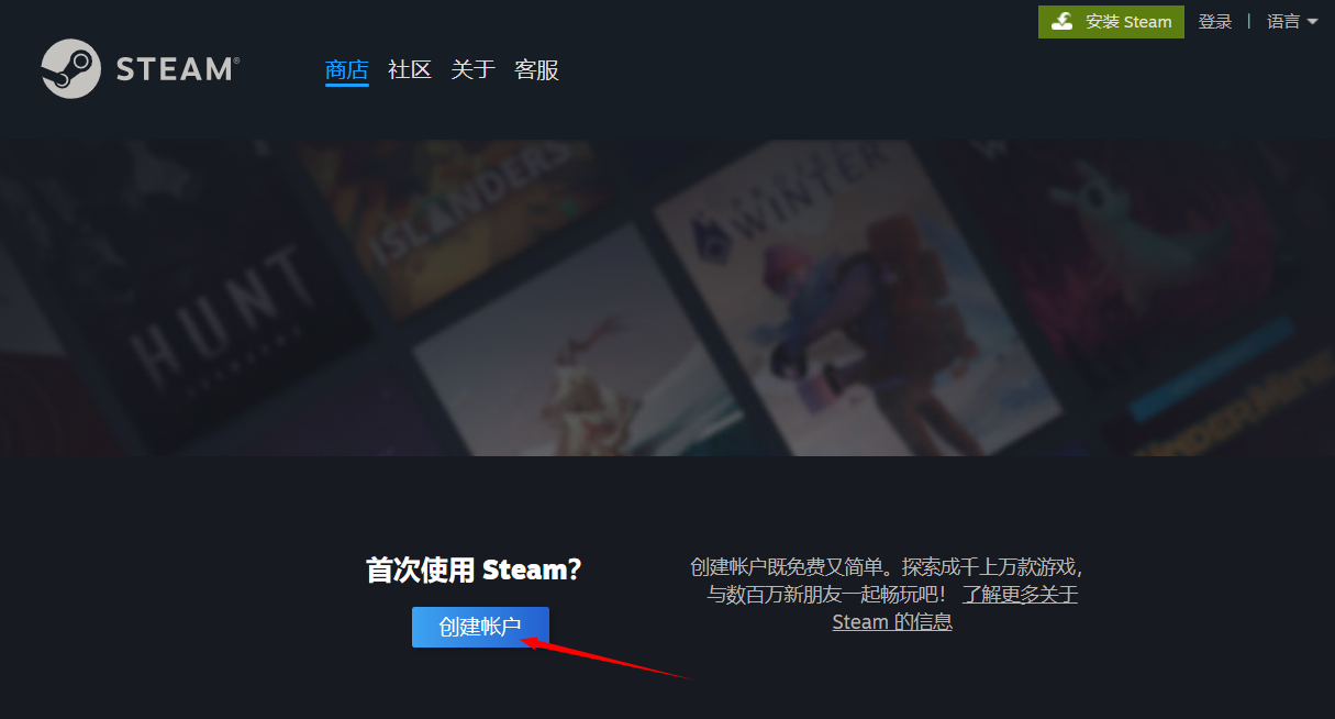 下面开始注册流程,需下载steam商店,包体不大,点击右上角相应的安装或者登录按钮即可弹出登录/注册的页面了。