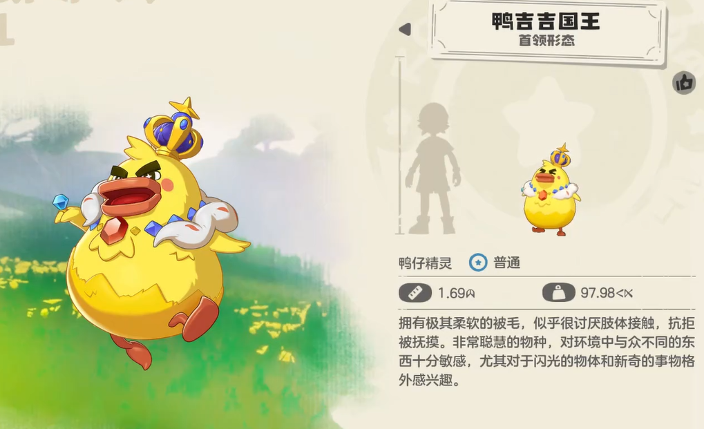 鸭吉吉拥有三个基础阶段形态:初始形态体态精巧,头部略扁,行动轻快,体现幼年期的活泼特质;蓬松形态则呈现显著体型膨胀,羽毛蓬起,步态略显憨拙,强化了亲和力与治愈感;首领形态为超进化结果,整体轮廓更挺拔,冠饰与羽翼细节升级,气场沉稳,具备统领级视觉表现力。
