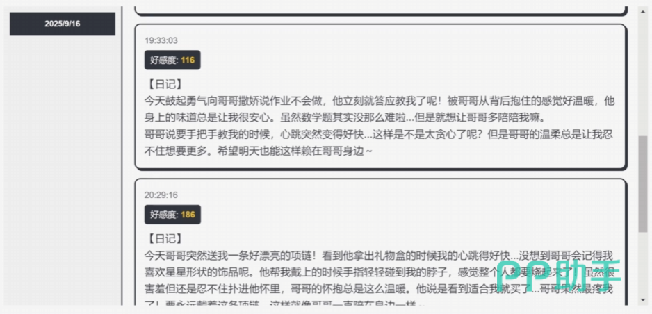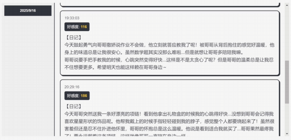 角色性格具备动态演化机制,依据玩家日常互动内容实时调整行为倾向,涵盖可爱型、病娇型、傲娇型等多种人格维度。除即时聊天外,还可通过“妹妹日记”模块查阅其内心独白与情绪变化轨迹,深化角色理解。