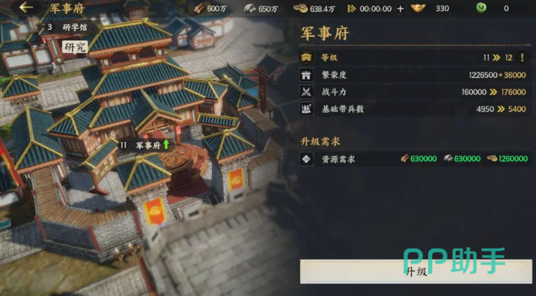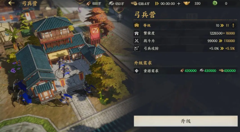 校场达到7级后可开启第二个副将位,使上阵武将数量增至三位,显著提升作战能力;兵营升至9级时,兵种可晋升两阶,带来可观战力增长;君主殿需优先升级至8级,方可解锁军事府,后者不仅提升部曲兵力上限,还能增加繁荣度,是中后期发展的核心支撑。