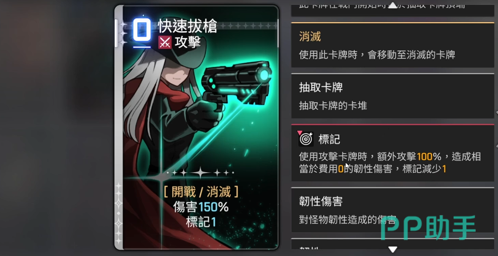 第二张为快速拔枪,这张卡牌主要用于应对高血量Boss类目标。其获取频率较高,容易在单局内积攒多张,从而实现连续攻击。每张均可独立造成可观伤害,叠加使用可在一回合内打出多次打击,形成高频输出链。同时,该卡冷却时间极短,无需等待长时间的能量积累,非常适合应用于速攻流派阵容,能在Boss施放关键技能前有效压低其生命值,降低团队所面临的威胁。