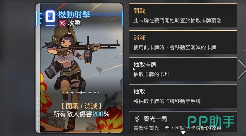 第一张为激动射击中立牌,这是一张高爆发的群体伤害卡牌。使用时可对所有敌方单位造成200%的范围伤害,能量消耗较低,性价比极高。释放后还能短时间提升使用者的暴击概率,进一步强化输出能力。由于具备优秀的清场能力,该卡牌在敌人血量偏低时使用效果最佳,尤其适合配合具有增伤效果的队友技能,实现瞬间爆发,迅速终结战斗。