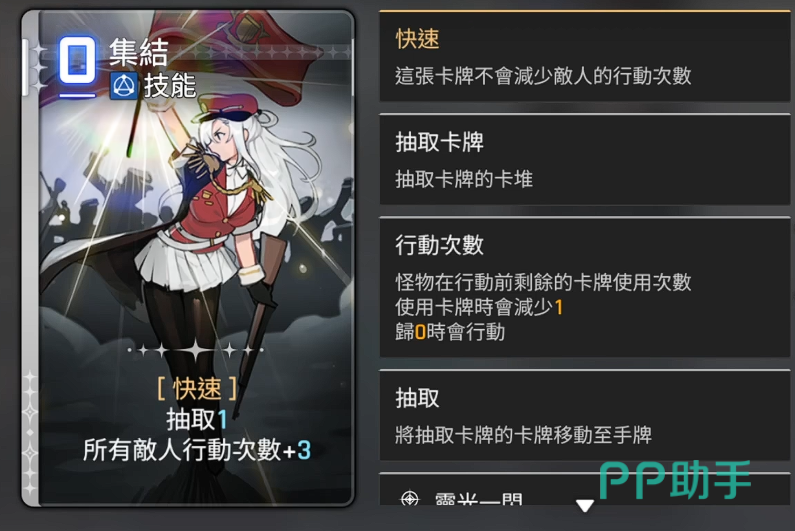第三张是集结,主要功能在于增加抽牌数量,使玩家在短时间内获得大量手牌资源,缓解卡牌短缺问题。此外,它还能推进队伍行动条,提前出手顺序,掌握战场主动权。对于依赖频繁出牌或需要稳定卡牌循环的阵容来说,这张卡能极大提升操作流畅度,避免因断牌导致输出中断,堪称构筑连贯攻势的重要支撑。