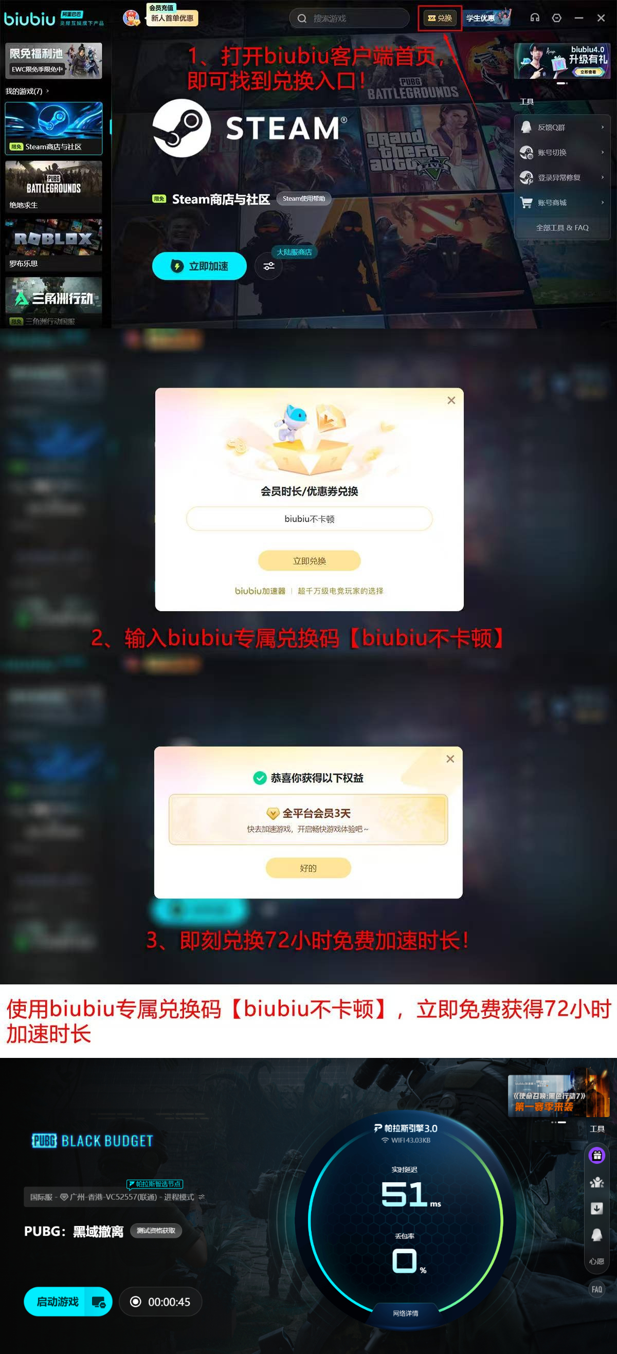 测试期间,biubiu加速器同步开启激励计划:每日完成指定加速任务即可累积抽奖机会,奖池包含限量测试资格及免加速时长卡。新用户注册即赠24小时全功能免费加速权益;叠加使用【biubiu不卡顿】服务后,可额外延长黑域撤离专属加速时长至72小时,总计享受96小时高品质网络保障。