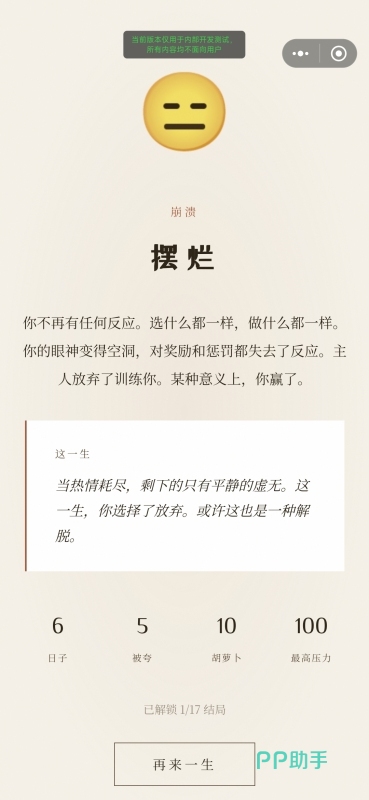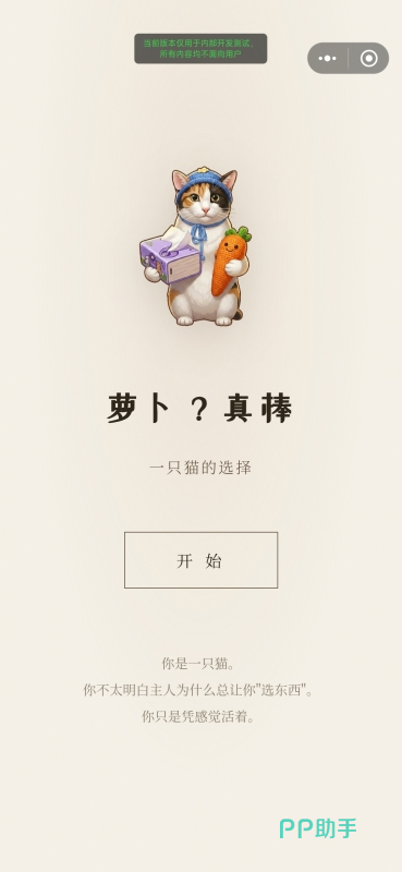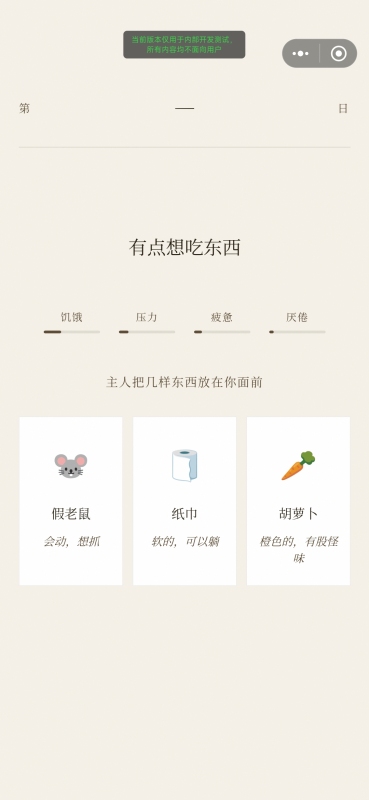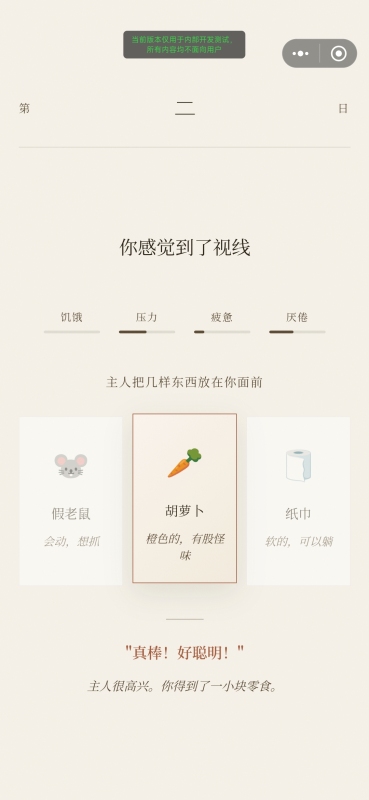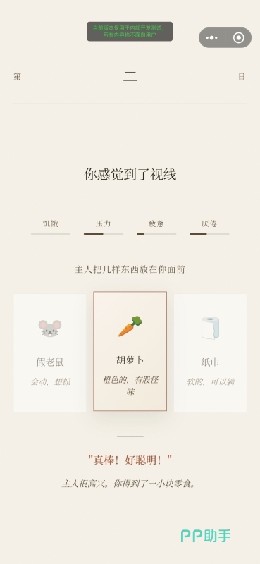 角色拥有三大动态状态值:厌倦值、压力值、饥饿值。不同选项直接影响数值波动——例如食用小鱼干可降低饥饿值,而选择黄瓜则会推高压力值。全游戏共设17种完全独立的结局,覆盖治愈向、荒诞向、解构向等多种风格。持续拒绝萝卜将触发“崩溃结局”,高频选取高压类道具则可能解锁“惊弓之猫”等特殊终章。每次重开均为全新叙事路径,重复可玩性极高。