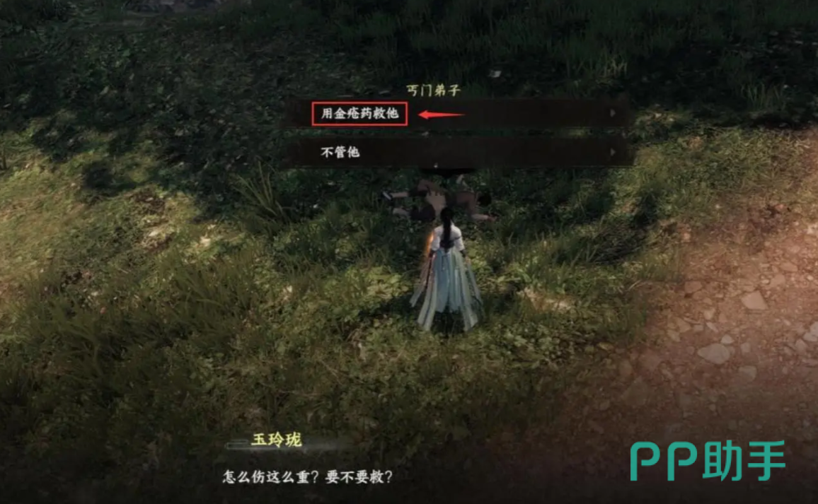 任务起始点位于不夜京地图的971.428坐标处,靠近该位置时会自动触发剧情,遇见一名身受重伤的丐门弟子。此时必须选择第一个对话选项施以援手,若选择置之不理,则任务线直接中断,无法继续推进。成功救助需要使用金疮药,该道具可在不夜京1031.30坐标处向NPC柳回春购买获得。