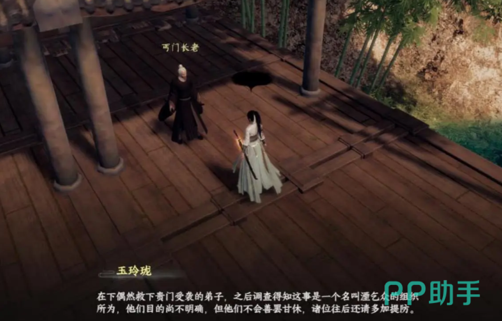 携带线索前往丐门主门,在入口处会触发与守门弟子的互动对话。交流结束后即可进入门派内部,直行至539.389坐标位置,找到丐门长老并与其对话。向其说明救助同门及神秘人追踪一事,长老将提供第二条重要情报,进一步完善任务脉络。