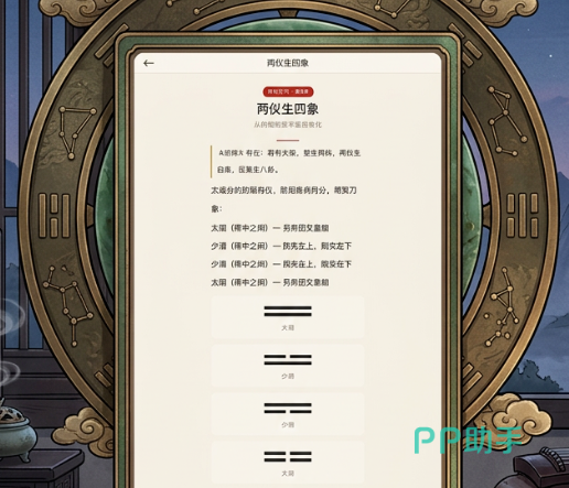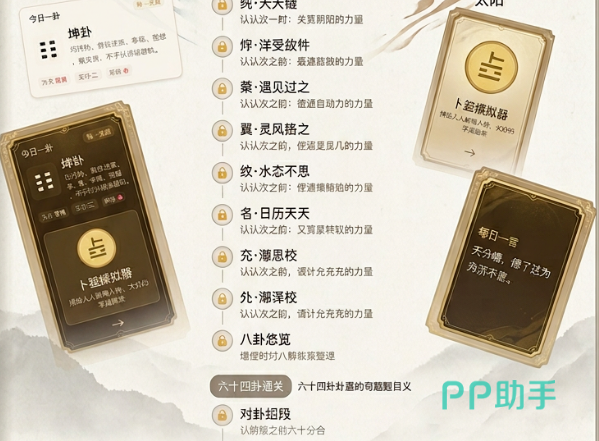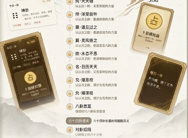 游戏内置101项结构化成就体系,每项成就严格对应《易经》原文、彖传、象传或历代注疏中的关键知识点。完成挑战即可累积“卜卦值”,用于解锁专属卦象图鉴、历史背景解析、古籍引文对照等深度内容,实现“玩中学、学中思”的闭环学习体验。