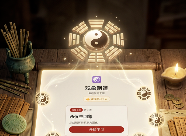 区别于多数仅在美术层面堆砌传统元素的国风产品,《易经101》聚焦文化内核的现代化转译——不神化占卜,不简化哲理,而是以系统性课程结构为骨架,融合轻量级情景互动模块,构建起覆盖全部六十四卦的认知路径。零基础用户可在渐进式引导中自然建立对卦象逻辑、阴阳变易与象数关系的理解框架。