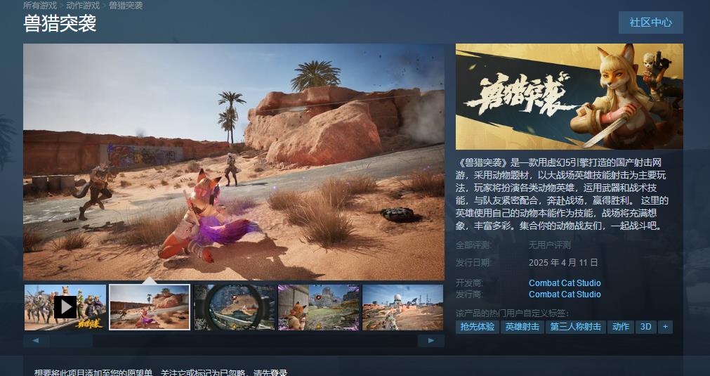 游戏在steam平台上的英文名称是Wild Assault,玩家如果喜欢这款游戏,就可以保持耐心等待,等到游戏上线之后就可以去体验。游戏中有全新的技能系统,将动物的特性深度的结合角色的技能。在战斗的过程中,不仅会具备良好的设计技巧,还需要将智能的设计结合技能操控。