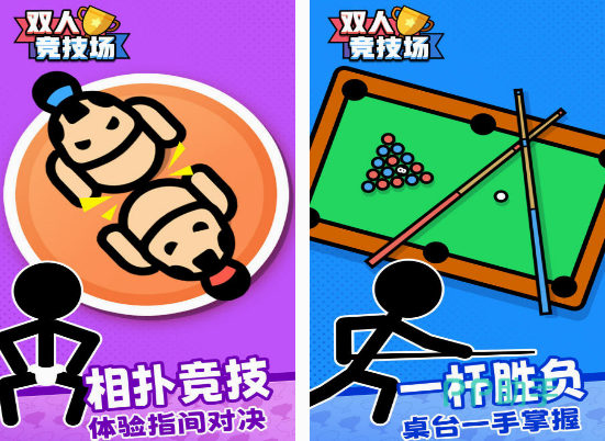 相对于只是能打台球的游戏,给大家介绍的这款,是专门为两个人玩游戏而推出的,既涵盖了台球游戏中的玩法,玩家可与对手进行较量,看看谁的水平更高,同时还有很多以双人展开竞技为主的小游戏,比如在极限竞速这种玩法中的两个玩家,需要操控汽车在赛道上比拼一下速度,而在相扑竞技中也要看谁的实力更强。