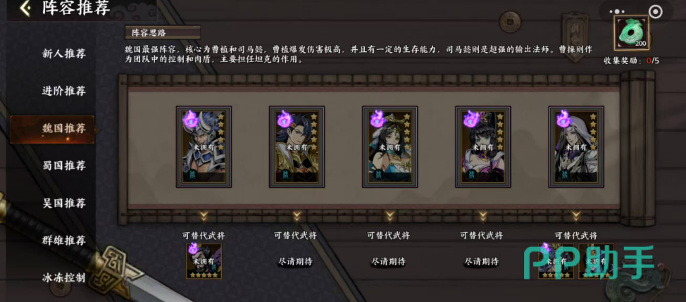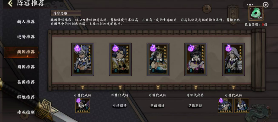 第三套为「魏国魔系专精流」,强调阵营羁绊与属性克制的深度协同。阵容固定由魔典韦、魔曹植、魔甄宓、魔张春华、魔司马懿组成,其中魔曹植与魔司马懿为双核驱动:曹植凭借超高单体爆发与中等生存能力,为司马懿提供稳定增益环境;司马懿则以高频率法术输出与控场能力成为团队节奏引擎。前排魔典韦可由曹操替代,魔司马懿亦支持郭嘉或贾诩替补,但其余三名魔系武将不可替换。该体系高度依赖魏国阵营加成与魔属性专属效果,配合曹操可进一步强化控制链与前排坦度,在面对蜀国或吴国主力阵容时具备显著克制优势。